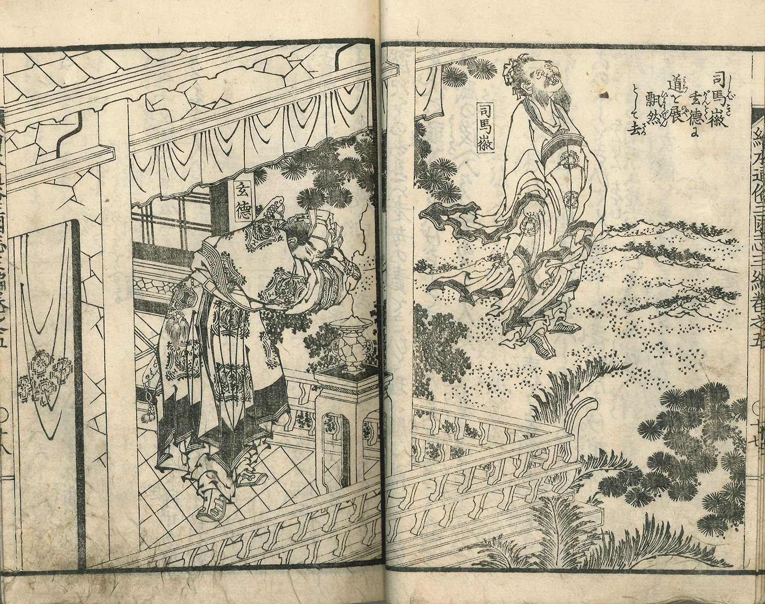 北斎の絵手本『北斎画鑑』の武志士(ぶしし)をまねて、北斎門人の二代葛飾戴斗が『絵本通俗三国志』三編 五に登場する司馬徽(しばき)として描いています。