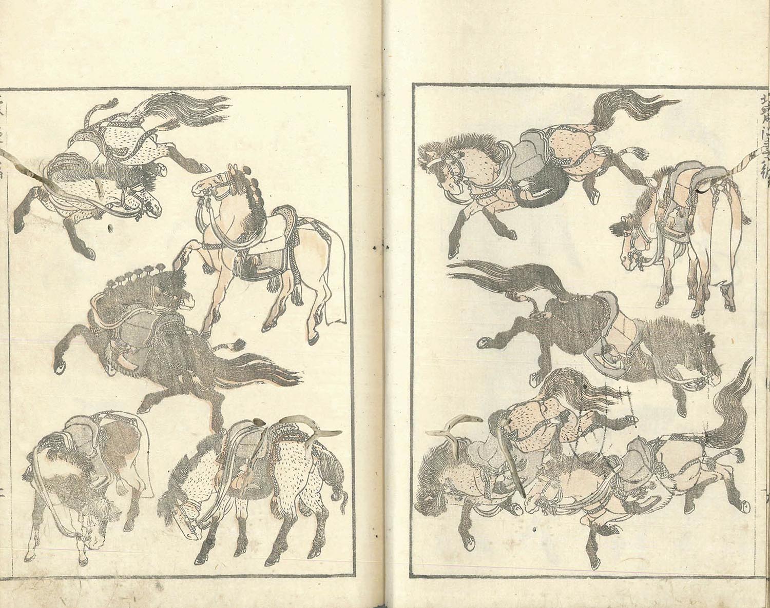 また、「しん板馬づくし」には様々な種類の馬が描かれていますが、『北斎漫画』六編を参考にして描かれた馬もいます。